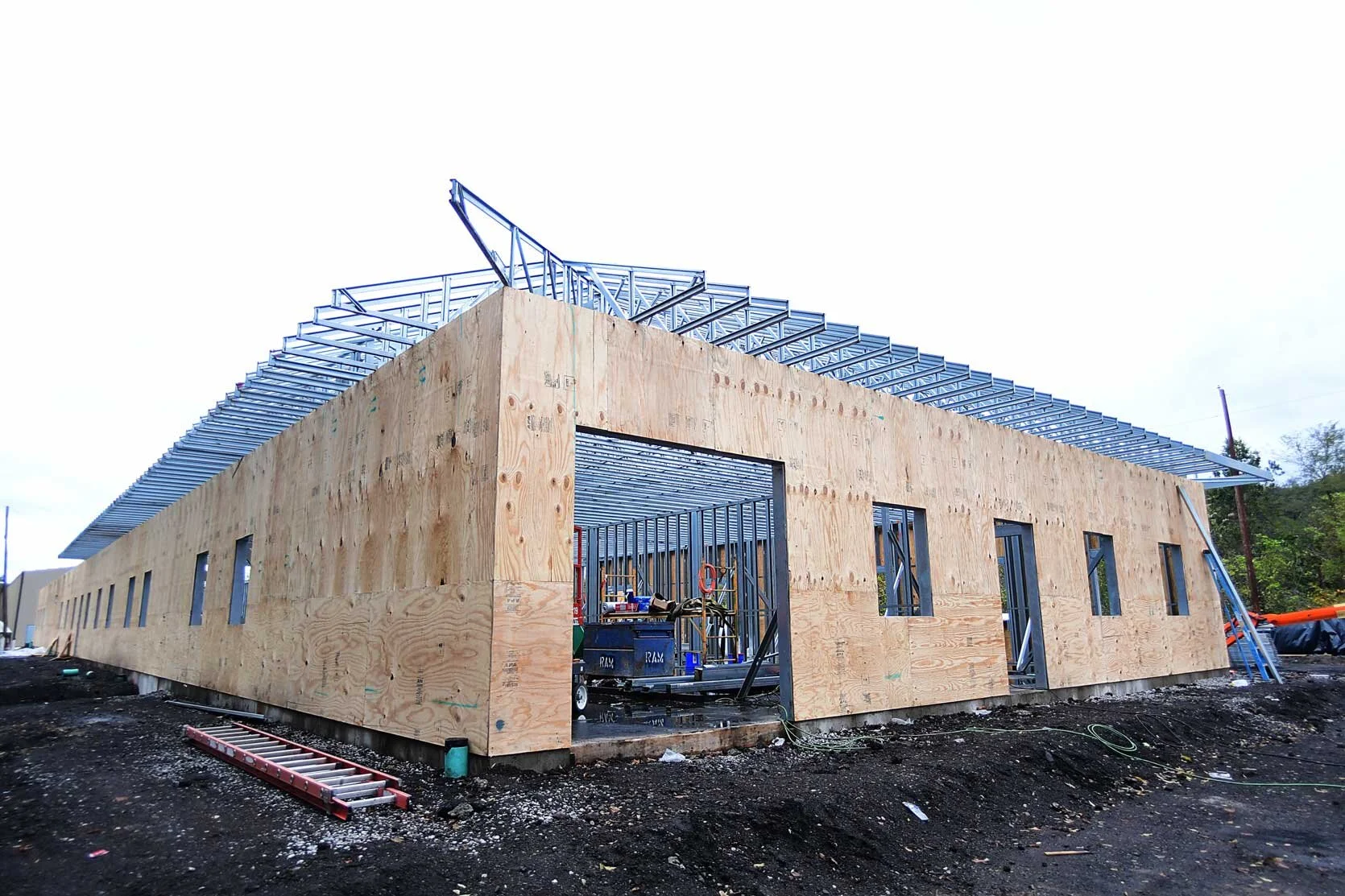 RAM played a major role by erecting light gage exterior framing around a steel skeleton, exterior wall sheathing, interior heavy gage metal studs, interior metal siding, drywall and acoustical ceilings in the office areas.